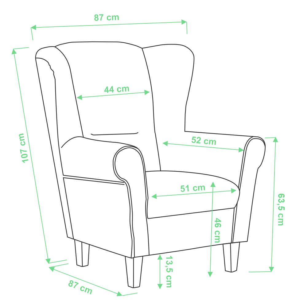Rozměr: š87 x h87 x v107 cm (výška je udávána i s podnoží), výška sedu 46cm, hloubka sedu 52cm