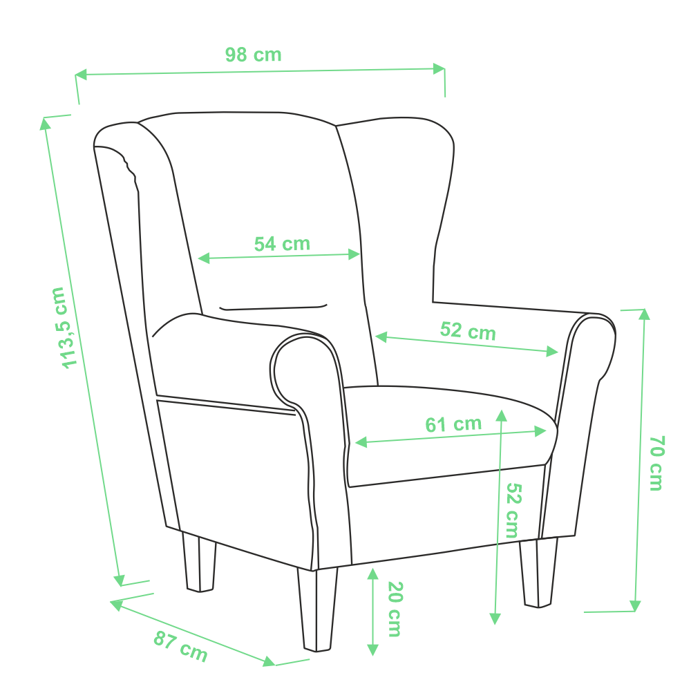 Rozměr - výška noh 20cm: š98 x h87 x v113,5 cm (výška je udávána i s podnoží), výška sedu 52cm, hloubka sedu 52cm